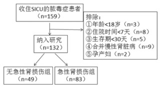 资料与方法 (一) 研究对象回顾分析2016年3月-2017年2月我院外科重症监护室连续收治的脓毒症患者159例。纳入标准:①年龄≥18岁;②住院时间>7天;③生存期>30天。排除标准:①孕产妇;②合并慢性肾脏病;③急性肾损伤的恢复期。见图 1。
