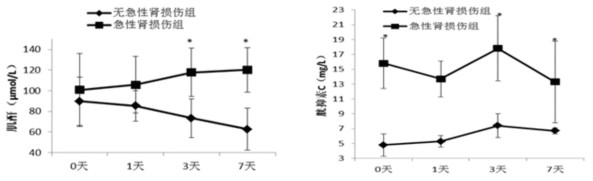 二、急性肾损伤组和无急性肾损伤组之间肌酐及胱抑素C水平随时间的对比见图 2。可见入科即刻急性肾损伤组的胱抑素C水平已明显高于无急性肾损伤组,而肌酐在入科后第三天才出现显著差异。