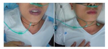 Figure 1 A, patient was markedly cyanotic even with high oxygen supply; B, 1 hour after treatment, cyanosis was gone. |