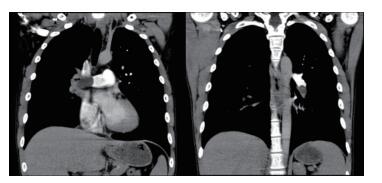 Figure 3 PCTA at 32 hours after Ⅳ enoxaparin showed reduction in the volume of pulmonary emboli and restoration of right pulmonary blood flow. |