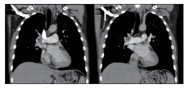 The patient's blood pressure was improved rapidly: 1 hour later, the heart rate was 124 beats/min, blood pressure 95/65 mmHg, respiratory rate 30 /min and oxygen saturation 95% on supplemental oxygen. And cyanotic disappeared (Figure 1B). A second ECG revealed sinus tachycardia with no ST-T wave abnormalities. The diagnosis of pulmonary embolism was made on pulmonary computed tomographic angiography (PCTA) (Figure 2). Subcutaneous enoxaparin 1 mg/kg continued over the next 12 hours. A second PCTA undertaken 30 hours later showed a substantial reduction in the volume of pulmonary emboli and restoration of right pulmonary blood flow (Figure 3). He made a full recovery and was discharged with a plan for long-term warfarin therapy.