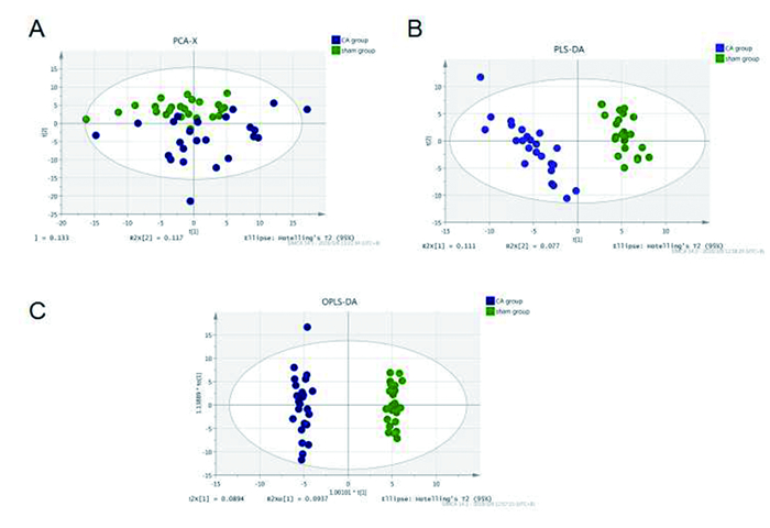 图 1 心脏骤停家兔血清代谢轮廓的改变。A,心脏骤停家兔和假手术组家兔血清代谢组学轮廓特征差异的PCA分析;B,心脏骤停家兔和假手术组家兔血清代谢组学轮廓特征差异的PLS-DA分析;C,心脏骤停家兔和假手术组家兔血清代谢组学轮廓特征差异的OPLS-DA分析 |