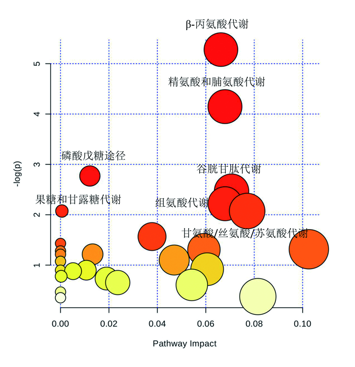 四、心脏骤停家兔的氨基酸和糖代谢发生明显紊乱通过对心脏骤停家兔的血清差异代谢物进行代谢通路分析发现,28条代谢通路在心脏骤停组和假手术组间存在差异(表 4),其中脂质代谢通路包括前原发性胆汁酸生物合成,氨基酸代谢通路包括β-丙氨酸代谢、精氨酸和丙氨酸代谢、甘氨酸、丝氨酸和苏氨酸代谢、组氨酸代谢、丙氨酸、硫代谢、天冬氨酸和谷氨酸代谢、亮氨酸和异亮氨酸生物合成、赖氨酸生物合成、色氨酸代谢、氮代谢、丙氨酸、半胱氨酸和蛋氨酸代谢、亮氨酸和异亮氨酸降解,糖类代谢包括谷胱甘肽代谢、果糖和甘露糖代谢、磷酸盐途径、咖啡因代谢、糖酵解、丁糖代谢、半乳糖代谢、淀粉和蔗糖代谢,维生素b6代谢,以及核苷酸代谢途径包括吡啶代谢、氨基乙酰-RNA生物合成、氨基酸和核苷酸代谢、嘌呤代谢。各代谢通路的权重见图 2。