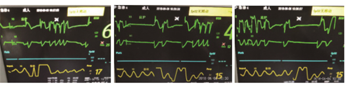 图 1 注:抓拍心电监护未见P波,QRS波宽大畸形,形态相似,提示室速与逸搏交替。 |