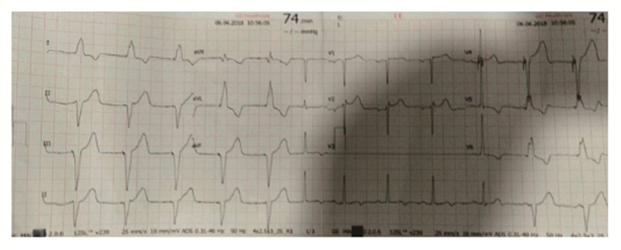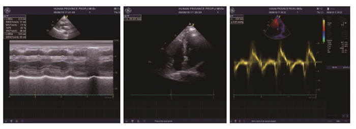 图 4 注:心脏彩超提示左房增大,室间隔增厚,EF值73%。 |