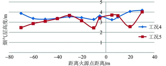 由图 8可以看出,当火灾发生360 s时工况4火灾层烟气高度大致呈现中间低两边高的趋势,且高度均在3 m以上,曲线也没有呈现出比较大的波动,这说明在火灾发生360 s时烟气几乎是以自由扩散的方式在站台层蔓延,开启风幕与站台排烟并没有对烟气层产生较大的扰动.而工况5的烟气层高度曲线波动较大,有些区域的烟气层高度甚至已经降到距地面2 m以下的位置,且其大部分区域的烟气层高度均低于工况4,这说明火灾发生360 s时开启轨顶排烟对烟气层已经有了一定的扰动.