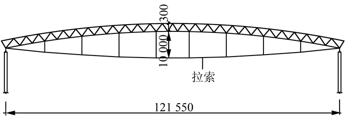 | 图 1 张弦桁架标准榀布置图(单位:mm) Figure 1 Layout drawing of one standard roof in truss string structure (unit:mm) |