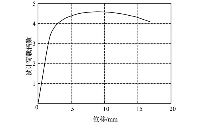设计荷载倍数-应力曲线对比表明,有限元计算结果与试验结果吻合良好,有限元计算结果是可靠的.根据有限元计算分析,得出节点试件设计荷载倍数-位移曲线如图 10所示,可知节点的极限承载力为设计荷载工况的4.7倍.在极限承载力作用下节点有限元计算云图如图 11所示,此时节点大部分区域已进入屈服,支座处出现全截面屈服,完全丧失承载能力.