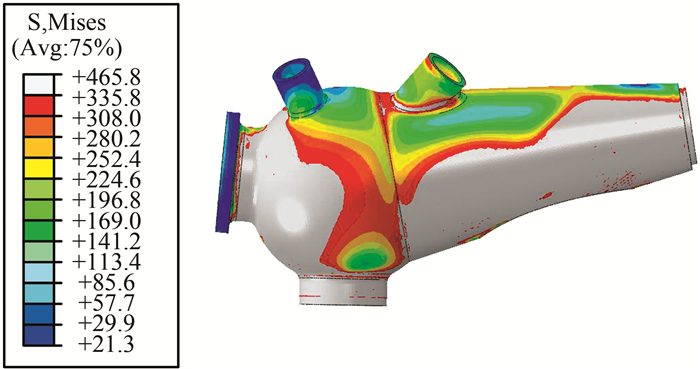 | 图 11 在4.7倍设计荷载工况下节点应力分布云图 Figure 11 Nephogram of stress distribution of joint under 4.7 times design load |
