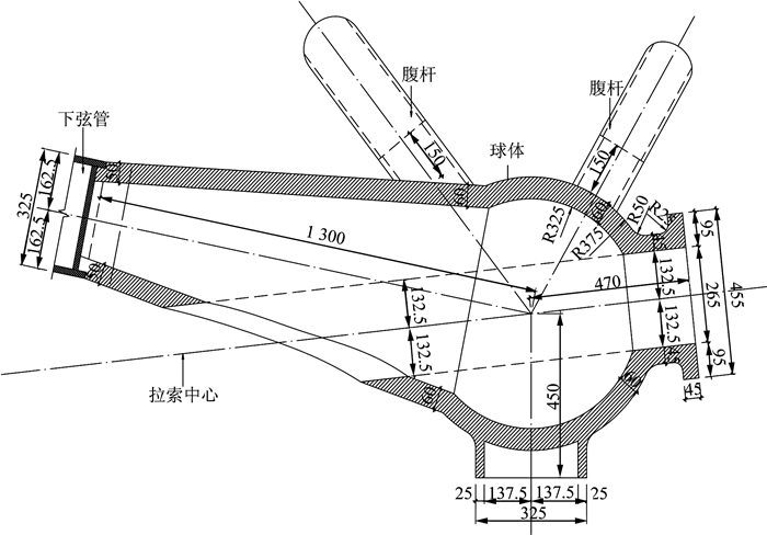 1 铸钢节点 1.1 试件 1.1.1 铸钢节点尺寸新疆国际会展中心2期工程左、右展厅滑动下弦支座处铸钢节点为拉索锚固节点,该铸钢节点包含1个内径为630 mm、外径750 mm的空心球和连接在该球节点上的7根圆截面杆件.最大杆件外径为650 mm,最小外径为300 mm,下弦杆厚度在100~120 mm之间渐变.