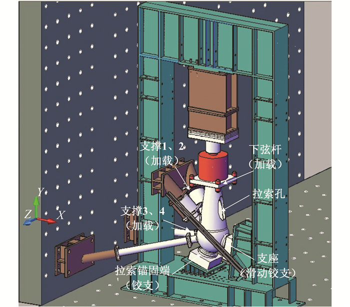 节点试件下弦杆采用10 000 kN液压千斤顶施加轴向压力;支撑1、2采用2 000 kN液压千斤顶施加压力;支撑3、4采用600 kN拉压千斤顶施加压力;支座处采用万向铰支座固定,固定时保证拉索平面与螺栓连接反力架的斜面贴紧;拉索锚固端直接固定在反力架上.节点加载装置示意图如图 3所示.