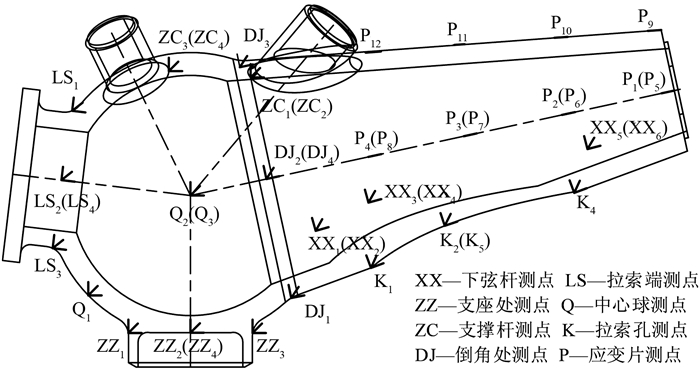 铸钢节点试件上共布置29个应变花,分别布置在4个支撑、拉索锚固端、支座倒角处、下弦杆与球面相贯处、拉索孔附近、球内部.此外,在下弦杆上部和两侧布置了12个单向应变片,量测下弦杆弯矩值.应变测点布置如图 5所示.