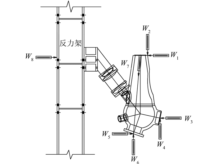 共布置8个数字位移计量测节点加载时可能发生的偏心、滑移、扭转等变形.在下弦杆端、支座、拉索端分别布置水平和竖向的位移计,测量加载中节点各部位的绝对位移;在节点一侧布置位移计,测量下弦杆端与拉索端的相对位移;在反力架柱连接辅助件处布置水平位移计,监测反力架的变形程度.位移测点布置示意图如图 6所示.