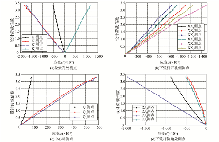 下弦杆与中心球连接处倒角布置4个应变花,设计荷载倍数-应变曲线如图 7(d)所示.由设计荷载倍数-应变关系可知,4个测点处的荷载-应变关系接近于直线,显示良好的弹性特征.