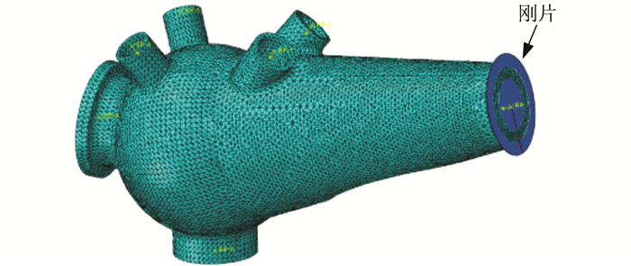 2 有限元分析根据铸钢节点缩尺试件的实测几何尺寸,在CATIA软件中建立精细化的三维实体模型,导入ABAQUS通用有限元分析软件,建立数值分析模型,如图 8所示.