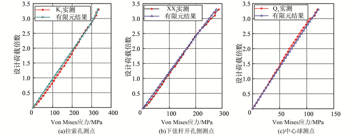 试验测得各应变花测点应变值,根据变形条件和广义胡克定律计算得出Von Mises应力.以试验荷载作为荷载取值进行有限元分析,提取结果中测点位置的Von Mises应力值与试验结果进行对比. 典型测点设计荷载倍数-应力曲线对比如图 9所示.