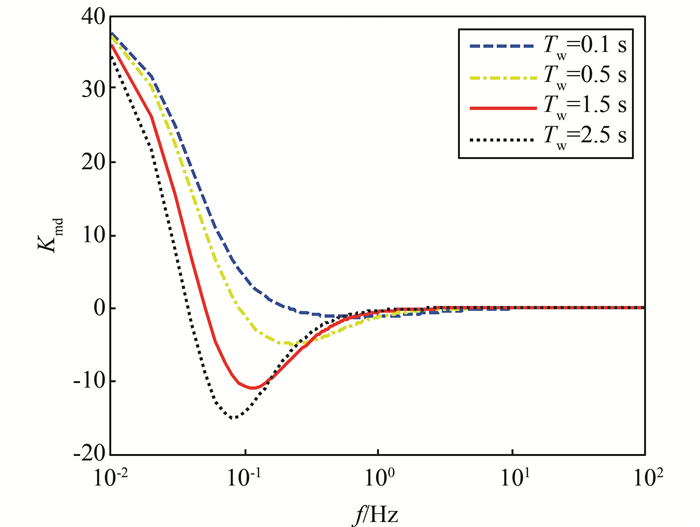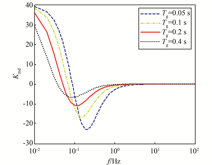 2.2 调速系统对阻尼特性影响频域分析依据前述方法,绘制出Kmd随振荡频率f(f=2πωd)及不同水轮机调速系统参数(Tw,R,Tg)变化的曲线,如图 3~5所示.