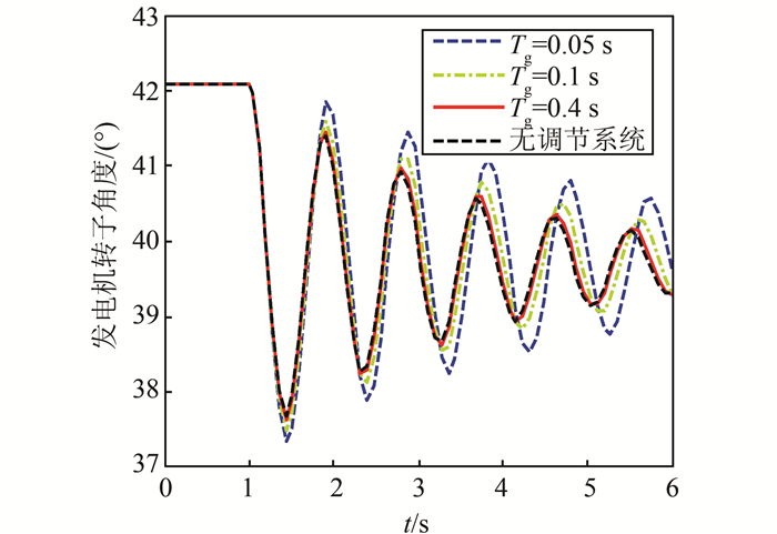 表 1是在f=1.0 Hz,R=0.05,Tw =2.0 s,Tg取不同值时,得出的阻尼特性计算结果;图 7是其时域仿真结果——发电机功角响应曲线.