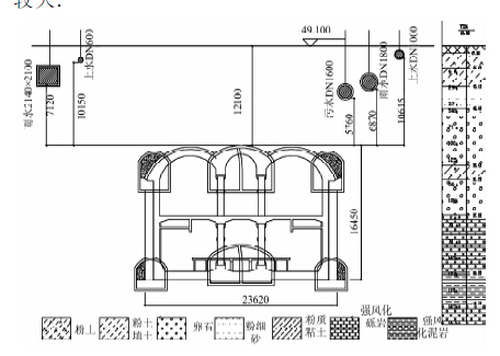 1 工程概况北京地铁16号线17标玉渊潭东门站位于月坛南街与三里河路T字交叉口处,为双层三跨暗挖地下岛式车站,主体采用PBA暗挖法施工,总长256.60m,总宽21.20 m,岛式站台宽12.00 m,底板埋深27.86 m,拱顶覆土约11.31 m.车站主体导洞剖面及地层构成见图 1.该车站所处地层有一层地下水,为层间水(三),水位埋深19.80~20.80 m,水位标高27.67~27.47 m,含水层主要为卵石层.开挖结构的中下部位于层间水(三)含水层中,底部位于砾岩层中.含水层主要为卵石⑦ 和卵石⑨ 层,该层地下水渗透系数大,补给充足,对结构施工影响较大.