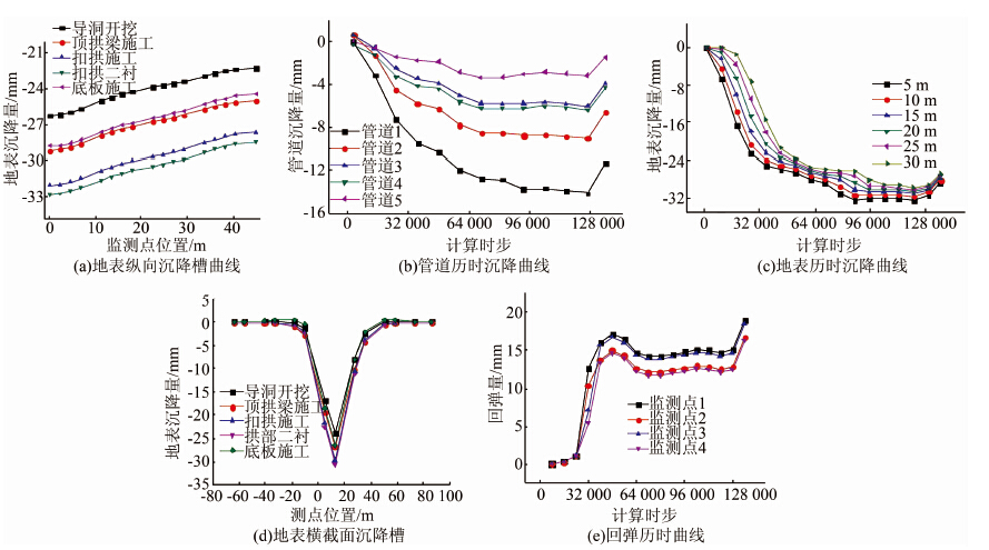 根据模型情况,地表纵向每隔5 m取一个数值监测断面,横向根据网格情况和距离车站中心的远近成梯度布置沉降监测点,数值监测点布置见图 3.数值监测点地表沉降历时曲线、地表沉降槽曲线、管道沉降历时曲线见图 4.