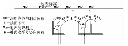 4 PBA暗挖地铁车站现场监测 4.1 监测范围及测点布置施工时监测范围主要包括主体结构两侧外50 m范围内,施工期间发生异常情况,如严重的涌水、涌砂、漏水、支护结构或周边建筑物及地下管线严重变形等,适当加大监测范围.监测对象主要包括导洞周边环境、支护结构体系及背后土体.监测断面图见图 5.