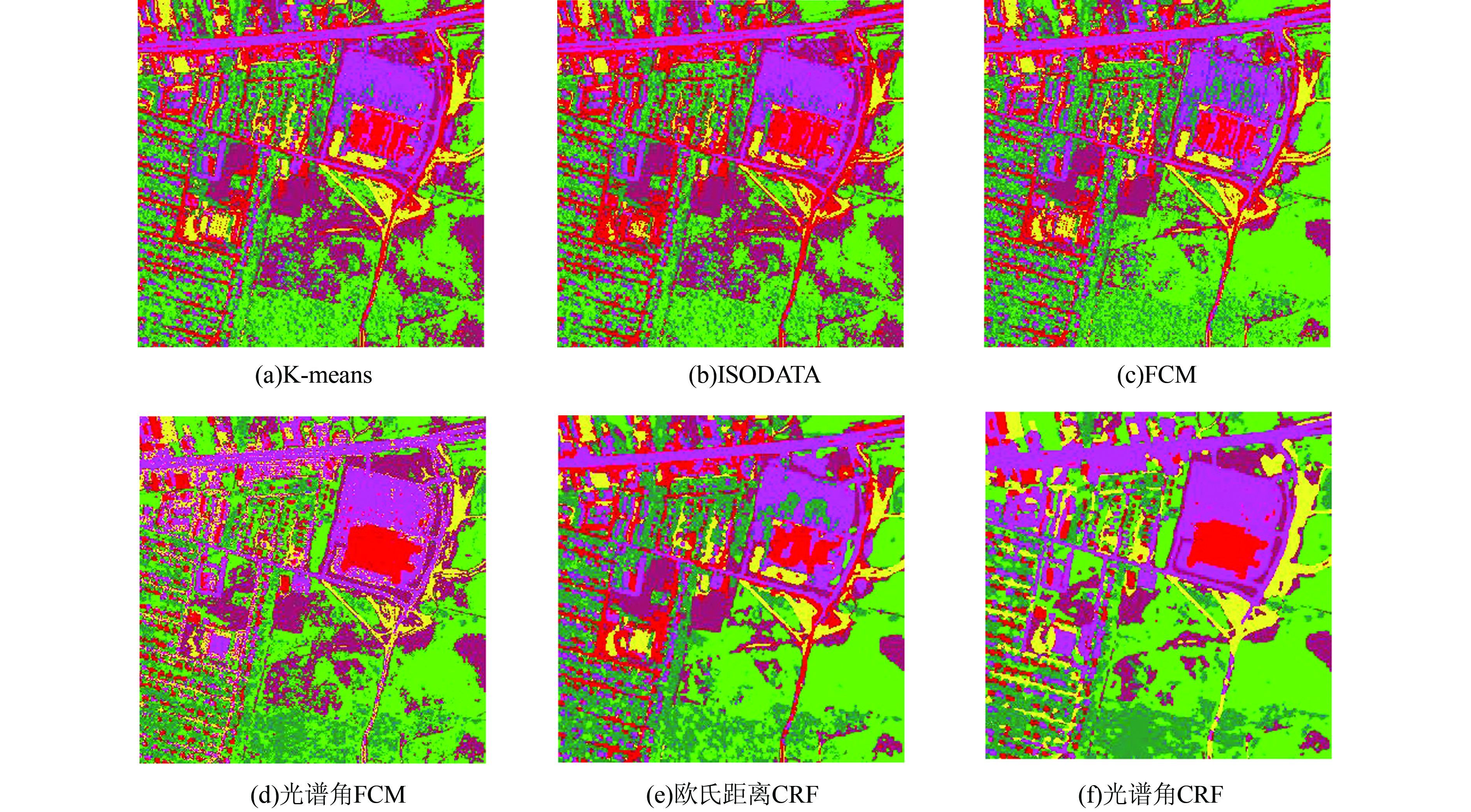 分类结果如图 5(a)~(f)所示.(a)~(c)是传统聚类方法的结果;(e)是传统的空谱融合方法的结果,类别交错在一起,错分严重;(d)和(f)是基于光谱匹配方法的结果,各类别之间可分离性强,依据先验知识,地物分布基本正确.对比(d)和(f),光谱角CRF从光谱匹配的角度融合了空间信息,分类结果噪声小,而且保持了地物的形状特征,解决了基于单像元光谱匹配方法的不足.如图中的黄色部分,水泥路面的提取效果得到了显著提升.