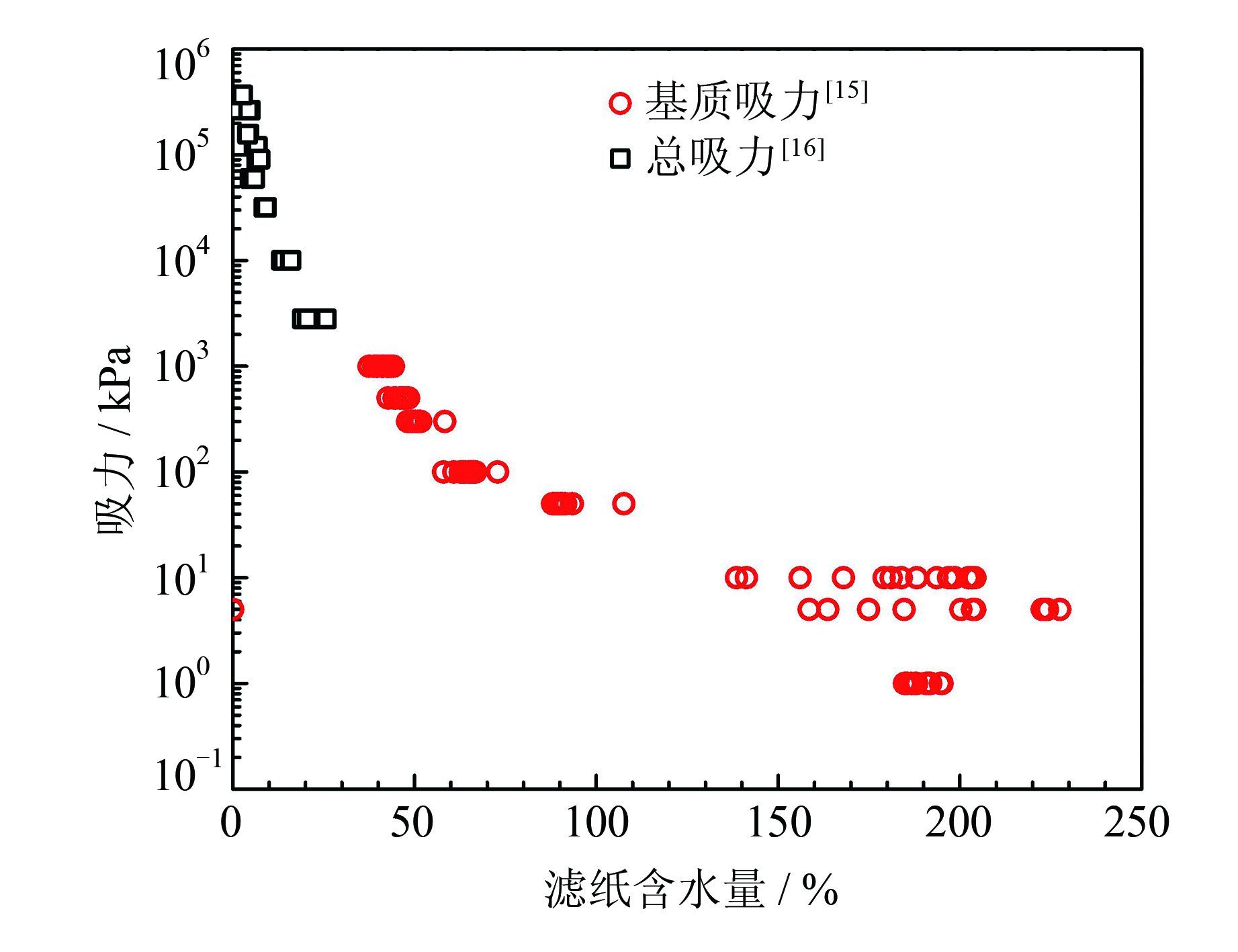 | 总吸力 | 白福青等[14, 20] | 通过配制不同浓度的NaCl盐溶液进行试验,在溶液上方放置2张干燥滤纸,密封平衡10 d后用精度为0.000 1 g的电子天平称量滤纸的重量及烘干后重量,求得滤纸含水率 |