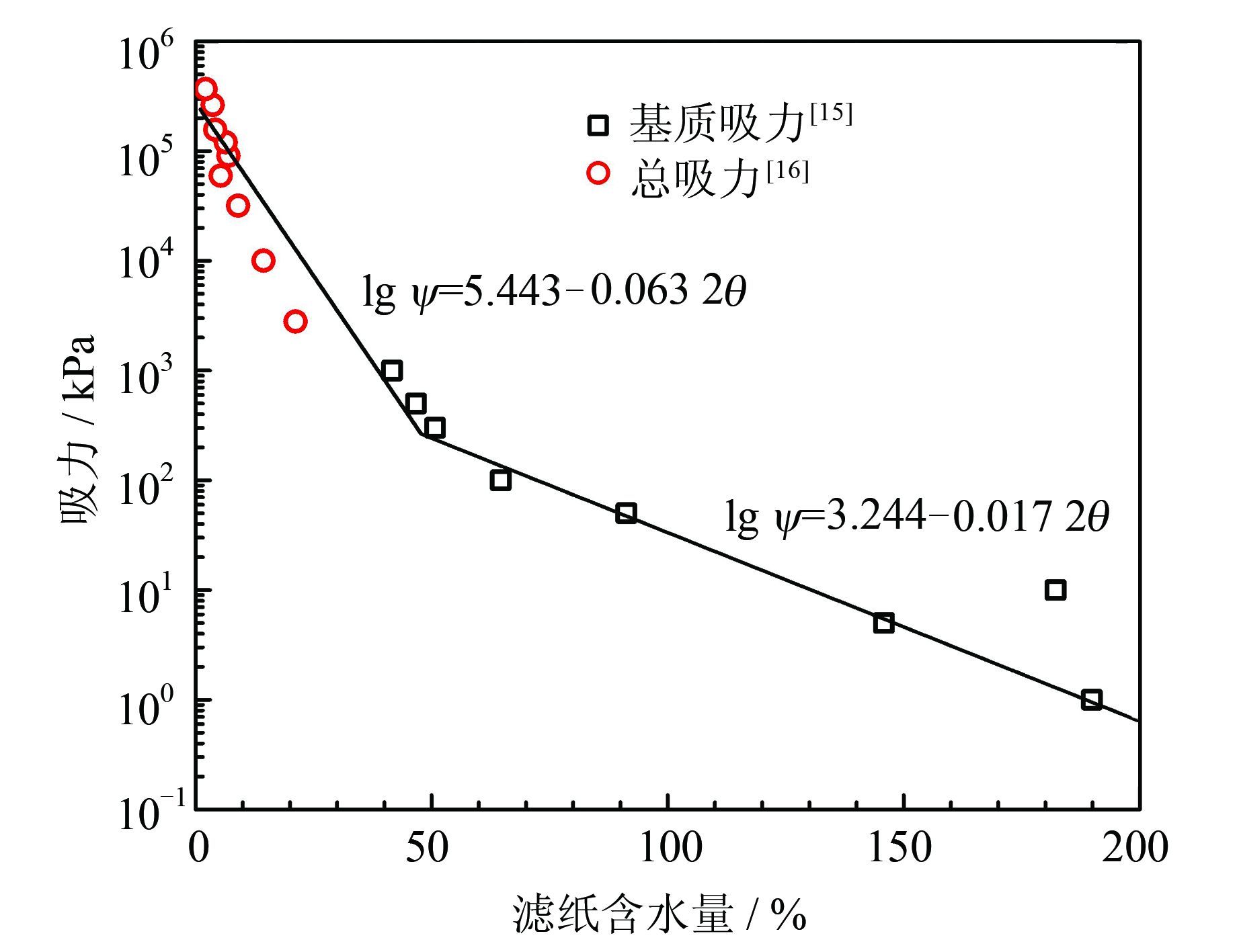 图 3给出了文献[15]、[16]中试验数据的平均值,可见其总体趋势比较明显,即滤纸含水率较低时,吸力变化比较接近一个斜率;滤纸含水率较高时,吸力变化接近另一个更平缓的斜率.根据2.2节的分析,而且试验采用的均是脱湿过程,可以将利用基质吸力和总吸力率定的数据点结合起来,利用双线性方程进行拟合可得率定曲线: