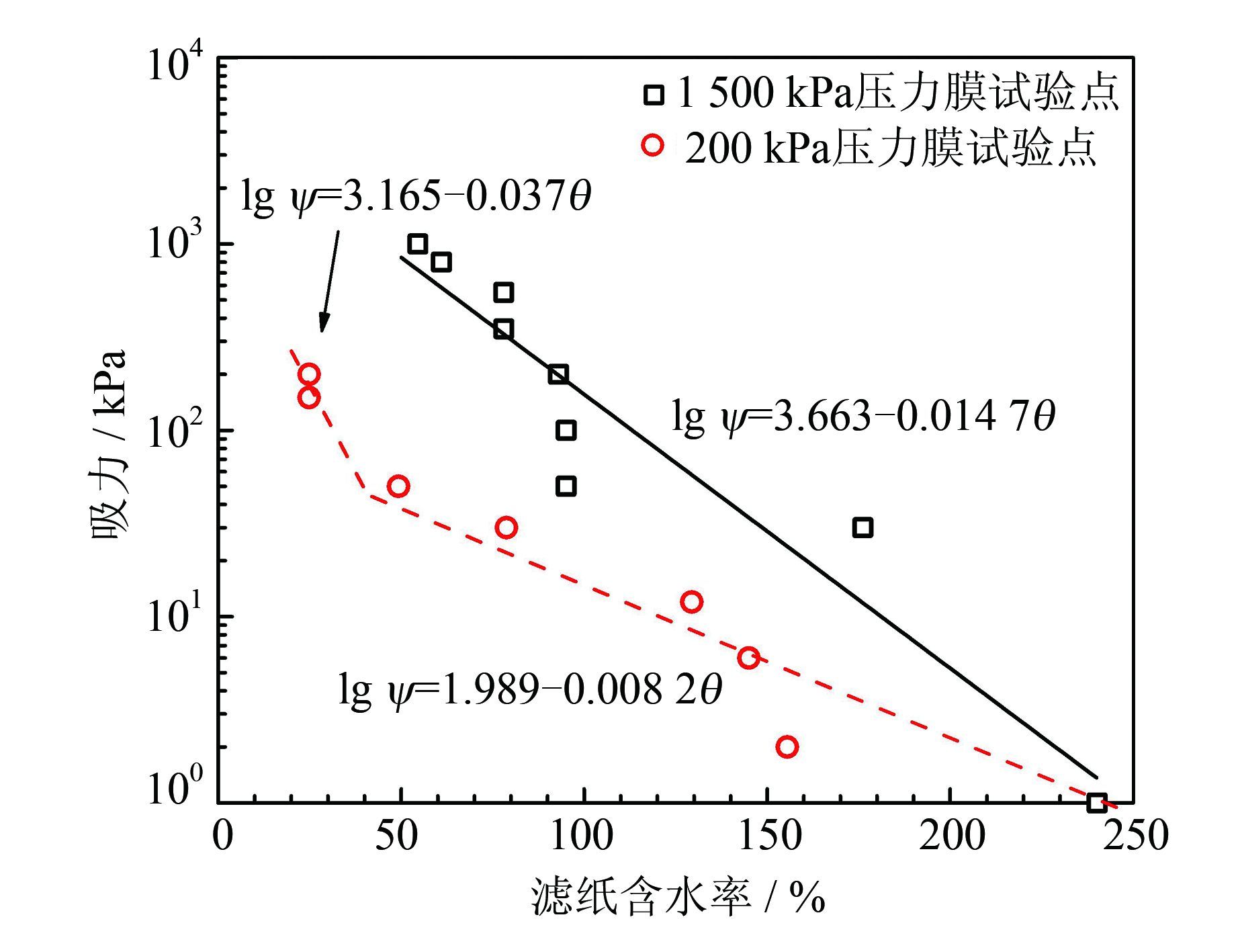1.2 滤纸吸力率定曲线确定滤纸法测定吸力的关键之处在于吸力率定曲线的准确性,吸力率定曲线表征的是滤纸在封闭空间达到平衡状态时其含水率与周围吸力的关系.通常采用压力板法、盐溶液法、土样法、离心机法等当中的一种或几种结合使用.其基本原理是让滤纸在不同已知吸力的环境中平衡,然后测定滤纸的含水率,从而获得吸力与含水率之间的关系曲线.