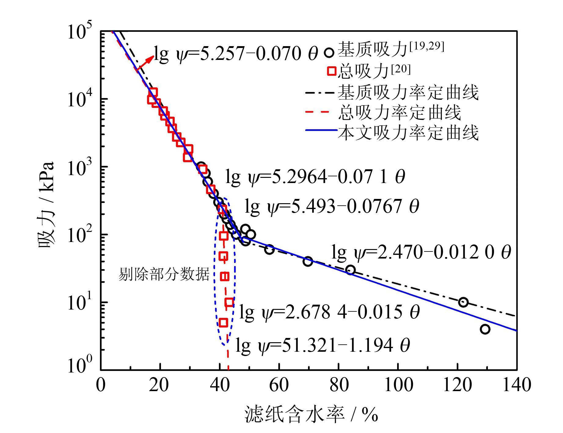 由于结合了不同来源吸力及不同吸力范围的大量试验数据,并剔除了准确度较低的数据,试验结果表现出比较稳定的趋势,新的拟合方程具有更好的代表性.而且新方程形式简单一致,更便于实际应用.