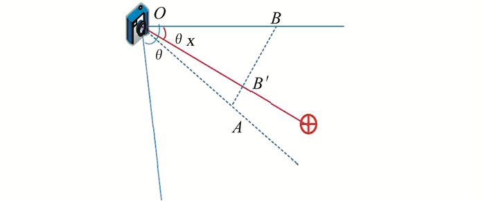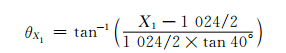 十字叉为目标在水平面上的投影,目标投影与相机的连线为OB′,左视野边界为OB,视野中线为OA,构建如图所示三角形OAB和三角形OAB′,已知相机的像素值为1 024×768,即水平方向上40°视角上的物体会映射到1 024个像素点上.Wii Remote是一个红外感知设备,视角与普通摄像头相比略小,因此在误差可接受范围内.这种映射关系可近似为线性的,即由像素值X1,可以推导出θX,过程如下式: