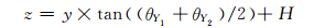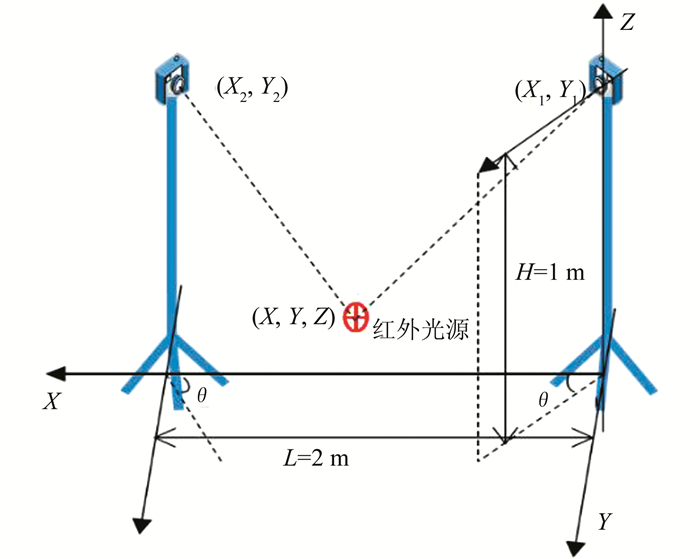 根据两个单摄像头所获取θX1、θY1、θX2、θY2的定位信息,和摄像头的布设信息,可以计算出目标的三维坐标.布设情况如图 3所示,计算过程如下:
