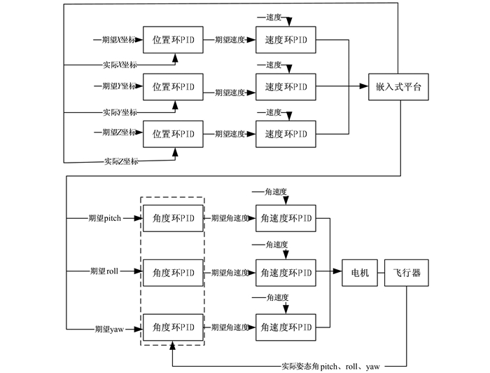 1.2.2 飞行器定位控制飞行器定位控制使用了多级串级PID控制理论,通过1.1节中计算得出的飞行器三维坐标定位信息,来计算期望的三维空间飞行速度,再通过期望飞行速度,计算得期望飞行姿态.将期望飞行姿态与飞行器控制器进行通信,飞行器以俯仰角、偏航角、翻滚角为输入量,对四轴的转速进行控制[9-13].