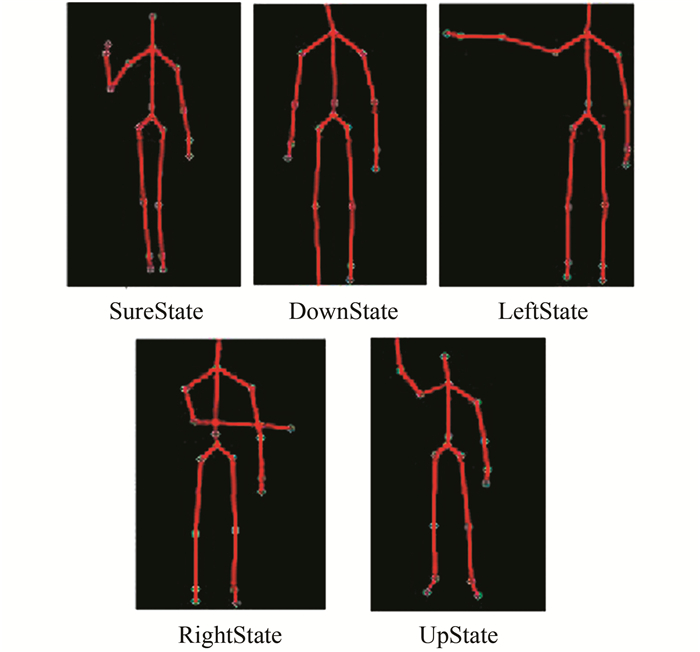 Kinect传感器可以传回在摄像头前的人的骨骼帧信息,一共有20个关节信息,其中重点使用到的为ELBOW、SHOULDER、WRIST等关节的坐标信息.通过计算各个关节之间相对位置,来判断当前的手势状态.