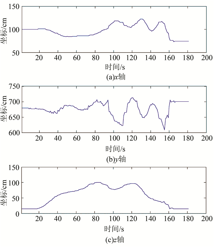 另一种是飞行器在飞行过程中的位置捕获、定位、数据滤波的测试.由静止时的测量可以确定,飞行器的定位精度在cm级,能够满足飞行器实时控制的要求.飞行器飞行过程中的坐标及滤波后的结果测试如图 7和图 8所示,滤波后的位置和速度均没有毛刺,符合控制要求.
