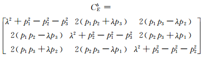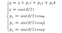 工程上一般运用范数为1的特征四元数,特征四元数的标量部分表示转角的一般余弦值,其矢量部分表示瞬时转轴n的方向.如下式表示矢量R相对参考坐标系旋转一个转角θ: