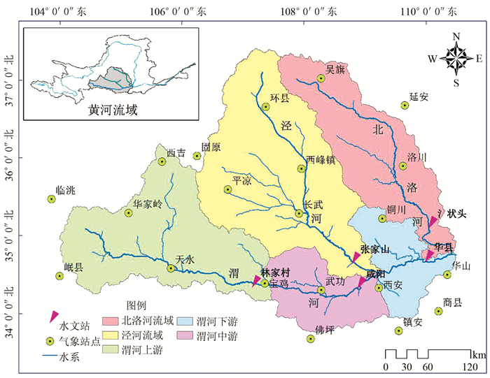 | 图 1 渭河流域分区及站点分布图 Figure 1 Study area partition in origin of Weihe River Basin |