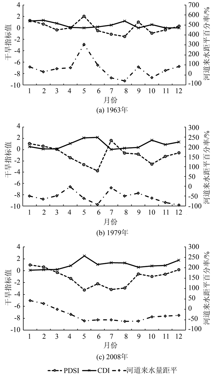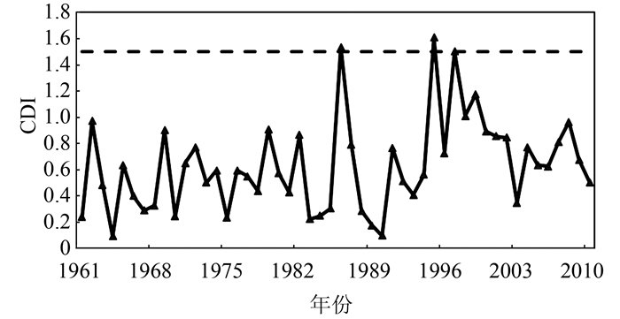 为进一步研究综合干旱指数对特定干旱事件的可靠性,对渭河流域年度旱情进行分析,选取1963、1979、2008年3个典型年作为一般干旱的代表年,利用PDSI指数和河道来水量距平百分率指数与CDI指数进行对比分析,图 3表明单一指标对干旱程度的反映较实际情况偏轻,相比之下,综合干旱指标能较为准确地描述干旱程度,对渭河流域的适用性更强;图 4为流域年综合指数变化情况,由图可以看出流域50 a来都处于持续干旱状态,一般以轻微和中等干旱为主,1986、1995和1997年的综合指数均大于1.5,判断为极端干旱年,与实际情况符合,故CDI有较强的可靠性.