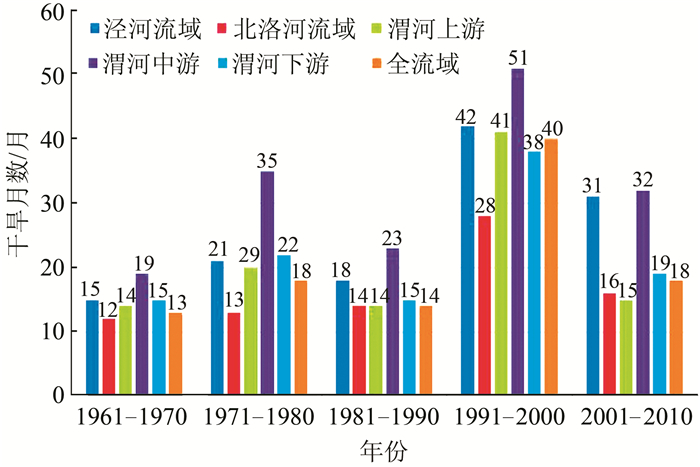 由于严重干旱和极端干旱对流域的影响较为严重,故只统计流域各分区发生严重干旱和极端干旱的月数,如图 5所示.结果表明:从20世纪60年代到21世纪初,干旱月数整体呈增加趋势;各区域20世纪70年代干旱月数相对于60年代均有微弱增加,渭河中游和下游增加最为显著,80年代相对来说变化不够明显,90年代开始干旱频次迅速增至40个月,旱度明显加重,21世纪00年代相对20世纪90年代各区域干旱月数均有减少趋势,但仍以渭河中游为最.