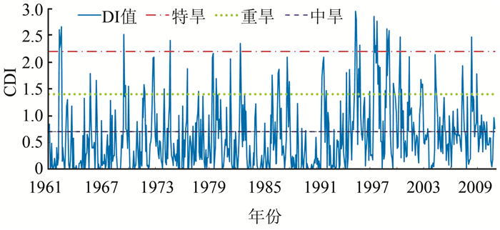 依据各指标的权重系数及区域逐月综合干旱指数CDI,同时参考区域干旱等级标准[10]得到综合干旱等级,如表 3所示.