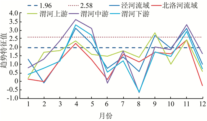 渭河流域CDI逐月变化如图 8所示,图 9为各个分区12个月CDI的变化趋势特征值.分析各区域月尺度干旱,可以得出:旱情严重的月份主要是4月和11月,这两个月各区域变干效果最明显,是需要重点关注的月份,6-8月份干旱趋势不明显.渭河中游地区有5个月份显著变干,其次是泾河流域地区为4个月,这两个地区需要重点关注.