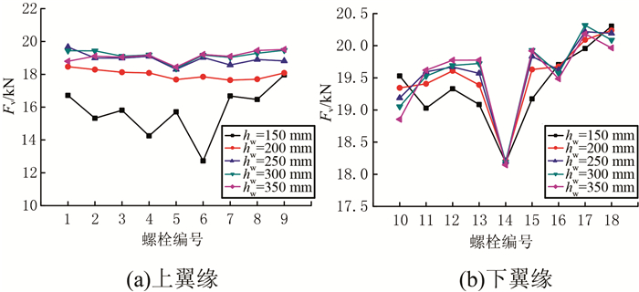 3) 腹板高度对于最大螺栓剪力Fv的影响表现为:上翼缘最大螺栓剪力Fv随腹板高度的增大而有所增大,腹板高度对下翼缘最大螺栓剪力Fv影响不大.