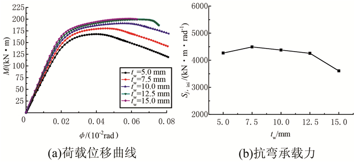 2) 杆件腹板厚度增加:节点承载力有所提高,节点初始刚度有所减低,但是提高和降低幅度均不大.