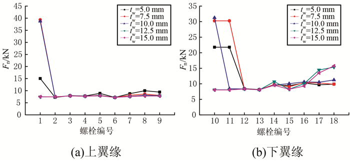 | 图 13 最大螺栓轴力的腹板厚度影响分析 Figure 13 Analysis of effect of web thickness on maximum axial force in bolt |