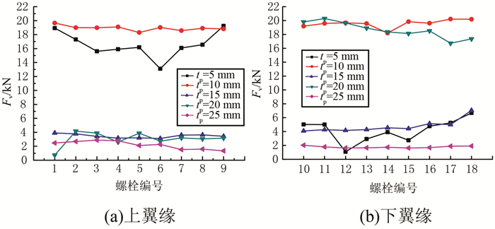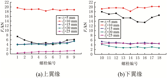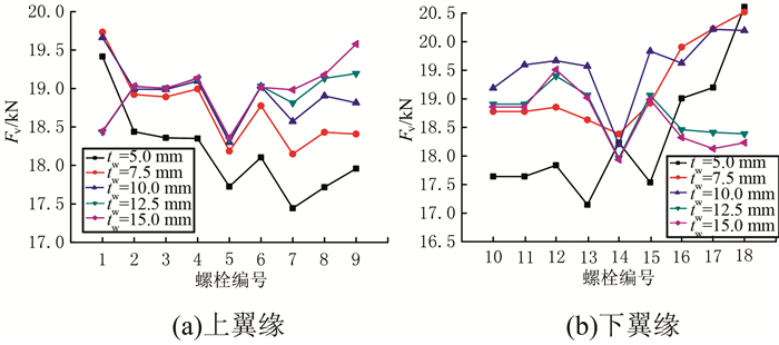 2) 铝合金工字型杆件最大螺栓剪力Fv在工字型杆件上、下翼缘分布均匀,随翼缘厚度的增大,先增大后减小.
