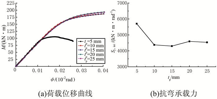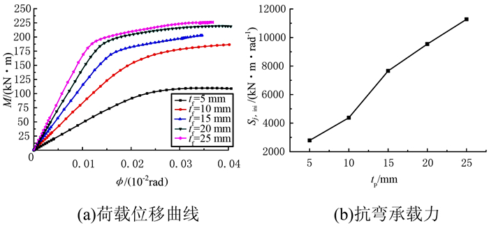 2.4 节点盘厚度tp的影响针对节点盘厚度tp对节点性能的影响分析,建立有限元模型SP1、SP17~SP20,分别取tp17=5 mm、tp1=10 mm、tp18=15 mm、tp19=20 mm、tp20=25 mm,模型其他几何参数按照表 1选取.节点盘厚度tp对铝合金盘式节点抗弯承载力、初始刚度、最大螺栓轴力及最大螺栓剪力影响的有限元分析结果如图 19~22所示.