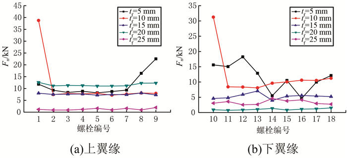 1) 除tf=5、10 mm试件外,铝合金工字型杆件最大螺栓轴力Fn分布均匀,随翼缘厚度无明显变化规律.