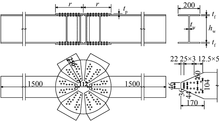 1 有限元模型及验证分析 1.1 铝合金盘式节点主要参数本文所研究铝合金盘式节点的几何简图如图 2所示.影响节点抗弯承载力及初始刚度的几何参数主要有:节点盘半径r、节点盘厚度tp、腹板高度hw、腹板厚度tw、翼缘厚度tf,参数意义及细部尺寸如图 2所示.以试件SP1为标准试件,SP2~SP4为试验-有限元验证试件,试件几何参数取值如表 1所示.