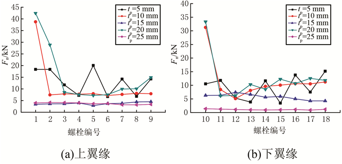 1) tp=10、20 mm,铝合金工字型杆件最大螺栓轴力Fn呈现1号、10号最大螺栓轴力明显大于其他螺栓;tp=5、15、25 mm,最大螺栓轴力在杆件上、下翼缘各螺栓之间分布较均匀.最大螺栓轴力随节点盘厚度无明显变化规律.