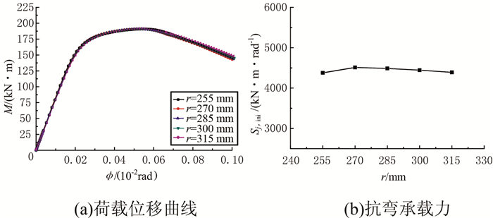2.5 节点盘半径r的影响针对节点盘半径r对节点性能的影响分析,建立有限元模型SP1、SP21~SP24,分别取r1=255 mm、r21=270 mm、r22=285 mm、r23=300 mm、r24=315 mm,模型其他几何参数按照表 1选取.节点盘半径r对铝合金盘式节点抗弯承载力、初始刚度、最大螺栓轴力及最大螺栓剪力影响的有限元分析结果如图 23~26所示.
